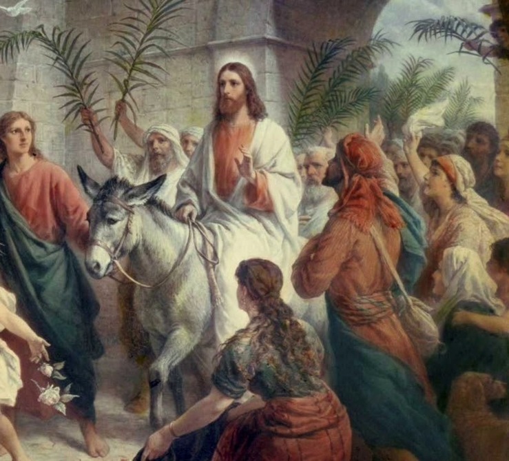 In the Gospels, Jesus entered Jerusalem riding a young donkey, and to the lavish praise of the townspeople who threw clothes, or possibly palms or small branches, in front of him as a sign of homage.