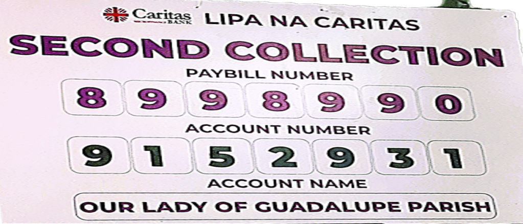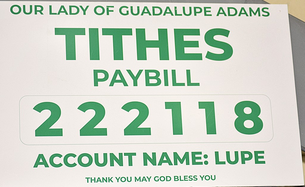 Our Lady of Guadalupe parish invites Christians to donate foodstuffs, stationery, clean and folded clothes, or cash to support the members of the community who are in need, and church projects. For financial contributions, Our Lady of Guadalupe has a Till number and Paybill number through which payments can be made to the parish using the following simple steps: